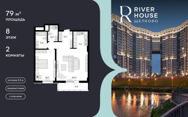 Просторная, светлая семейная квартира в жилом комплексе бизнес-класса RIVER HOUSE Щёлково! Семейная ипотека от 3.5%. Беспроцентная рассрочка. Индивидуальные дисконтные предложения. Дом сдан. Оформление в собственность. Ключи сразу после заключения договора купли-продажи. RIVER HOUSE Щёлково это изысканный жилой проект полноценного бизнес-класса с фокусом на качественное семейное проживание в самом центре города на набережной реки Клязьма. - Оригинальная архитектура, увеличенная площадь остекления, эксклюзивная вечерняя подсветка фасада. - Просторные семейные квартиры с высокими потолками 3.3 м в вариантах черновой, предчистовой и чистовой отделки. - Роскошные трехуровневые пентхаусы с открытыми террасами на кровле. - Лаунж-зона на кровле, где можно устроить уютный вечер с друзьями, отдохнуть и полюбоваться панорамными видами на город. - Вся необходимая инфраструктура и сервисы на первых двух этажах: детский сад, супермаркет, институт красоты, медицинский центр, стоматология, ПВЗ и многое другое. - В каждом подъезде 4 лифта один со спуском в паркинг, лобби с авторским дизайном, консьерж-сервисом и мягкой зоной ожидания. - Круглосуточная охрана, видеонаблюдение, бесключевая система доступа. - Двухуровневый подземный паркинг на 540 машино-мест и 260 кладовых. - Закрытый двор-парк без машин с ландшафтным дизайном, детскими и спортивными площадками, летним амфитеатром и собственным спуском к набережной. - Шаговая доступность ко всей инфраструктуре центра города: школы, детские сады, гимназии, кафе и рестораны, кинотеатр, перинатальный центр. - Три благоустроенных парка, в один из которых - Солнечные часы - можно спуститься со двора дома. RIVER HOUSE Щёлково это дом-впечатление и особый статус, которые останутся вашим детям и станут частью фамильной истории.