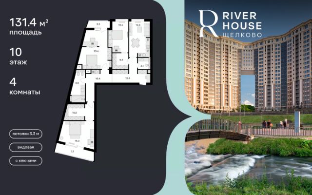 Просторная, светлая семейная квартира в жилом комплексе бизнес-класса RIVER HOUSE Щёлково! Семейная ипотека от 3.5%. Беспроцентная рассрочка. Индивидуальные дисконтные предложения. Дом сдан. Оформление в собственность. Ключи сразу после заключения договора купли-продажи. RIVER HOUSE Щёлково это изысканный жилой проект полноценного бизнес-класса с фокусом на качественное семейное проживание в самом центре города на набережной реки Клязьма. - Оригинальная архитектура, увеличенная площадь остекления, эксклюзивная вечерняя подсветка фасада. - Просторные семейные квартиры с высокими потолками 3.3 м в вариантах черновой, предчистовой и чистовой отделки. - Роскошные трехуровневые пентхаусы с открытыми террасами на кровле. - Лаунж-зона на кровле, где можно устроить уютный вечер с друзьями, отдохнуть и полюбоваться панорамными видами на город. - Вся необходимая инфраструктура и сервисы на первых двух этажах: детский сад, супермаркет, институт красоты, медицинский центр, стоматология, ПВЗ и многое другое. - В каждом подъезде 4 лифта один со спуском в паркинг, лобби с авторским дизайном, консьерж-сервисом и мягкой зоной ожидания. - Круглосуточная охрана, видеонаблюдение, бесключевая система доступа. - Двухуровневый подземный паркинг на 540 машино-мест и 260 кладовых. - Закрытый двор-парк без машин с ландшафтным дизайном, детскими и спортивными площадками, летним амфитеатром и собственным спуском к набережной. - Шаговая доступность ко всей инфраструктуре центра города: школы, детские сады, гимназии, кафе и рестораны, кинотеатр, перинатальный центр. - Три благоустроенных парка, в один из которых - Солнечные часы - можно спуститься со двора дома. RIVER HOUSE Щёлково это дом-впечатление и особый статус, которые останутся вашим детям и станут частью фамильной истории.