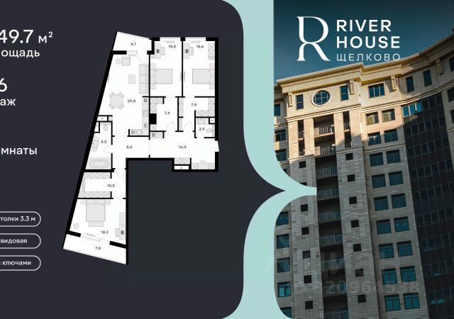 Просторная, светлая семейная квартира в жилом комплексе бизнес-класса RIVER HOUSE Щёлково! Семейная ипотека от 3.5%. Беспроцентная рассрочка. Индивидуальные дисконтные предложения. Дом сдан. Оформление в собственность. Ключи сразу после заключения договора купли-продажи. RIVER HOUSE Щёлково это изысканный жилой проект полноценного бизнес-класса с фокусом на качественное семейное проживание в самом центре города на набережной реки Клязьма. - Оригинальная архитектура, увеличенная площадь остекления, эксклюзивная вечерняя подсветка фасада. - Просторные семейные квартиры с высокими потолками 3.3 м в вариантах черновой, предчистовой и чистовой отделки. - Роскошные трехуровневые пентхаусы с открытыми террасами на кровле. - Лаунж-зона на кровле, где можно устроить уютный вечер с друзьями, отдохнуть и полюбоваться панорамными видами на город. - Вся необходимая инфраструктура и сервисы на первых двух этажах: детский сад, супермаркет, институт красоты, медицинский центр, стоматология, ПВЗ и многое другое. - В каждом подъезде 4 лифта один со спуском в паркинг, лобби с авторским дизайном, консьерж-сервисом и мягкой зоной ожидания. - Круглосуточная охрана, видеонаблюдение, бесключевая система доступа. - Двухуровневый подземный паркинг на 540 машино-мест и 260 кладовых. - Закрытый двор-парк без машин с ландшафтным дизайном, детскими и спортивными площадками, летним амфитеатром и собственным спуском к набережной. - Шаговая доступность ко всей инфраструктуре центра города: школы, детские сады, гимназии, кафе и рестораны, кинотеатр, перинатальный центр. - Три благоустроенных парка, в один из которых - Солнечные часы - можно спуститься со двора дома. RIVER HOUSE Щёлково это дом-впечатление и особый статус, которые останутся вашим детям и станут частью фамильной истории.