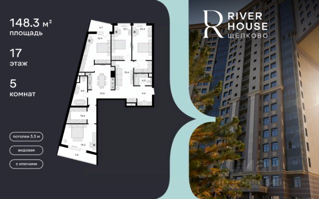 Просторная семейная квартира в жилом комплексе RIVER HOUSE Щёлково. Это изысканный жилой проект премиум-класса с фокусом на качественное семейное проживание в самом центре города на набережной реки Клязьма. Обладает рядом преимуществ, обеспечивающих максимальный комфорт жизни семьи: - Планировка "распашонка" - окна выходят на разные стороны, обеспечивая много света и свежего воздуха. - Просторный холл с возможностью функциональной организации пространства. - Большая кухня-гостиная для семейных ужинов и приёма гостей. - Высокие потолки 3,3 м - ощущение свободы и воздуха. - Кладовая и гардеробная для удобного хранения. - Два полноценных санузла. - Две просторные лоджии, где можно обустроить зону отдыха или рабочее место. Семейная ипотека. Беспроцентная рассрочка. Индивидуальные дисконтные программы. Дом сдан. Оформление в собственность. Ключи сразу после заключения договора купли-продажи. Расположение, транспортная доступность: - Центр Щёлково: напротив дома находится площадь Ленина. - Расстояние до МКАД: 19 км по Щёлковскому шоссе, 40 минут на машине без пробок. - Автобусы и маршрутки - 45-50 минут до метро Щёлковская. - Электропоезд - 10 минут автобусом до ж/д станции Воронок, далее 45 минут до Ярославского вокзала. Комфорт и безопасность: - Круглосуточная охрана, видеонаблюдение, бесключевая система доступа. - Закрытый двор-парк без машин с ландшафтным дизайном, детскими и спортивными площадками. - Двухуровневый подземный паркинг на 540 машиномест и 260 кладовых. Архитектура: - Оригинальная архитектура, увеличенная площадь остекления, эксклюзивная вечерняя подсветка фасада. - Роскошные трехуровневые пентхаусы с открытыми террасами на кровле. - Просторные семейные квартиры с высокими потолками 3.3 м в вариантах черновой, предчистовой и чистовой отделки. Инфраструктура: - На территории комплекса: детский сад, супермаркет, институт красоты, медицинский центр, стоматология, ПВЗ и многое другое. - Собственный спуск к набережной реки Клязьма, выход в благоустроенный парк "Солнечные часы". - Шаговая доступность ко всей инфраструктуре центра города: школы, детские сады, гимназии, кафе и рестораны, кинотеатр. - Лаунж-зона на кровле, где можно устроить уютный вечер с друзьями, отдохнуть и полюбоваться панорамными видами на город. RIVER HOUSE Щёлково - это дом-впечатление и особый статус, которые останутся вашим детям и станут частью фамильной истории. Звоните, чтобы получить консультацию и записаться на просмотр квартиры! Продам 5-комнатную квартиру первичка в Щелковском районе Московской области.