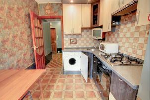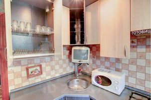 Кухня: Обеденный стол со стульями, холодильник, газовая плита с духовкой, микроволновая печь (СВЧ), электрический чайник, стиральная машина, телевизор, вся необходимая посуда для приготовления и приёма пищи.
