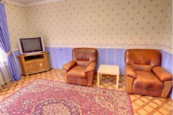 1 комната: Раскладной диван-кровать с матрасом, два кожаных кресла, телевизор, журнальный столик.