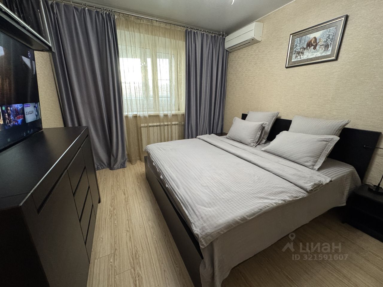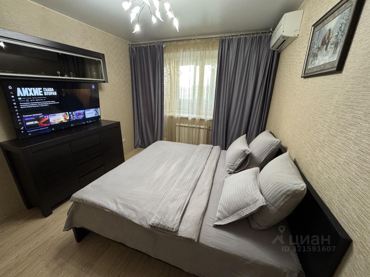 - Спальня: широкая кровать 180200 с ортопедическим матрасом, Smart TV 50", прикроватные тумбы, комод