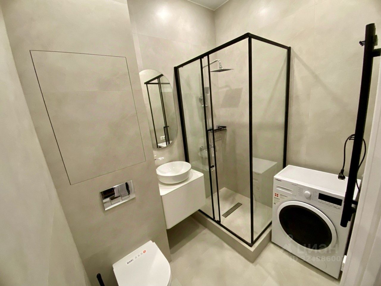 Совмещенный санузел выполнен в современном стиле с душевой кабиной и качественной сантехникой.