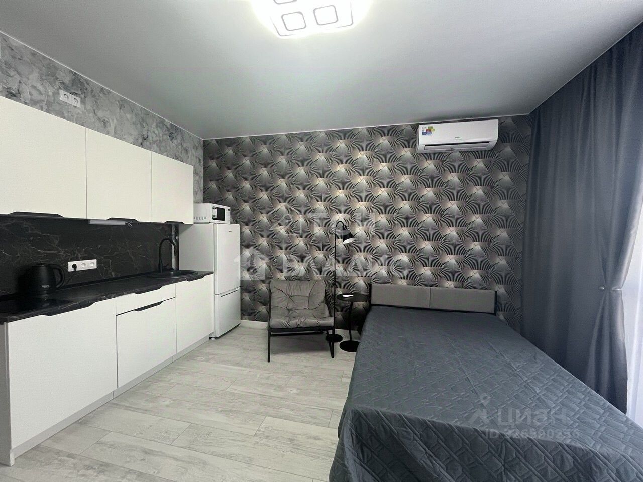 Полностью укомплектована: новый двуспальная кровать, кухонный гарнитур, холодильник, варочная панель, стиральная машина, микроволновая печь, чайник, кондиционер. Дополнительная мебель обсуждается по запросу. В прихожей большой встроенный зеркальный шкаф. Окна во двор!
