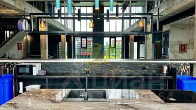 Барная стойка 4 метра длиной и открытый кухонный остров с духовкой, варочной панелью и раковиной. 2 больших обеденных стола.