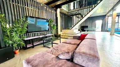 Барная стойка 4 метра длиной и открытый кухонный остров с духовкой, варочной панелью и раковиной. 2 больших обеденных стола.
