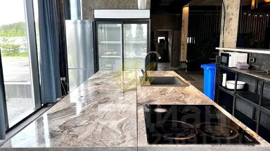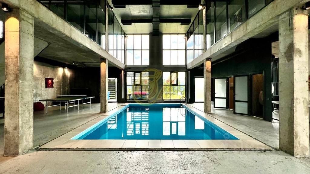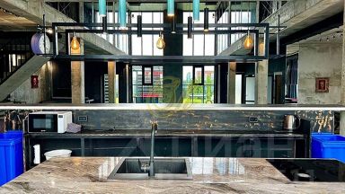 Барная стойка 4 метра длиной и открытый кухонный остров с духовкой, варочной панелью и раковиной. 2 больших обеденных стола.