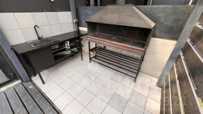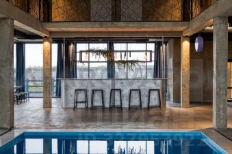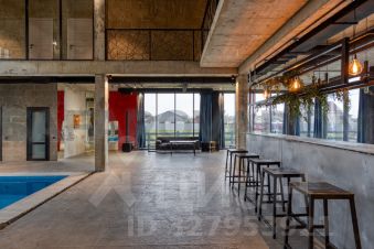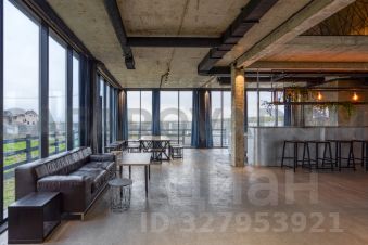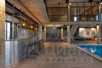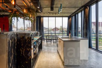 Барная стойка 4 метра длиной и открытый кухонный остров с духовкой , варочной панелью и раковиной. Два больших обеденных стола.