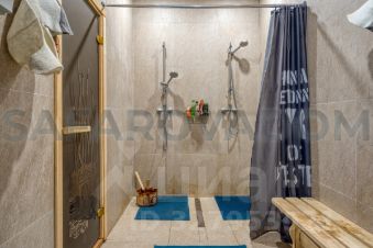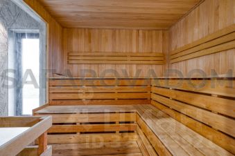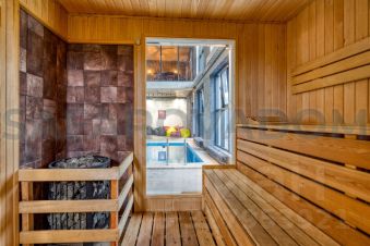Сауна со стеклянной стеной и видом на бассейн. Два душа. Два санузла.