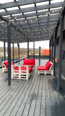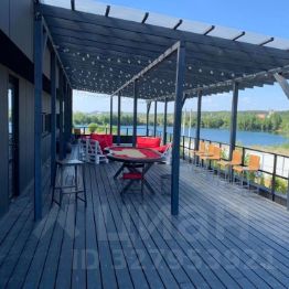 Выход на открытую уличную террасу размером 20х4 метра с великолепным видом на озера и лес. Площадка для пляжного волейбола.