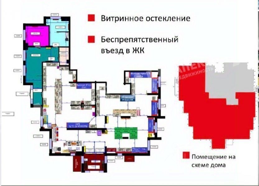 Первый этаж 17-этажного дома. Магнит занимает площадь наиболее выгодное положение в комплексе. Единственное форматное помещение под супермаркет.