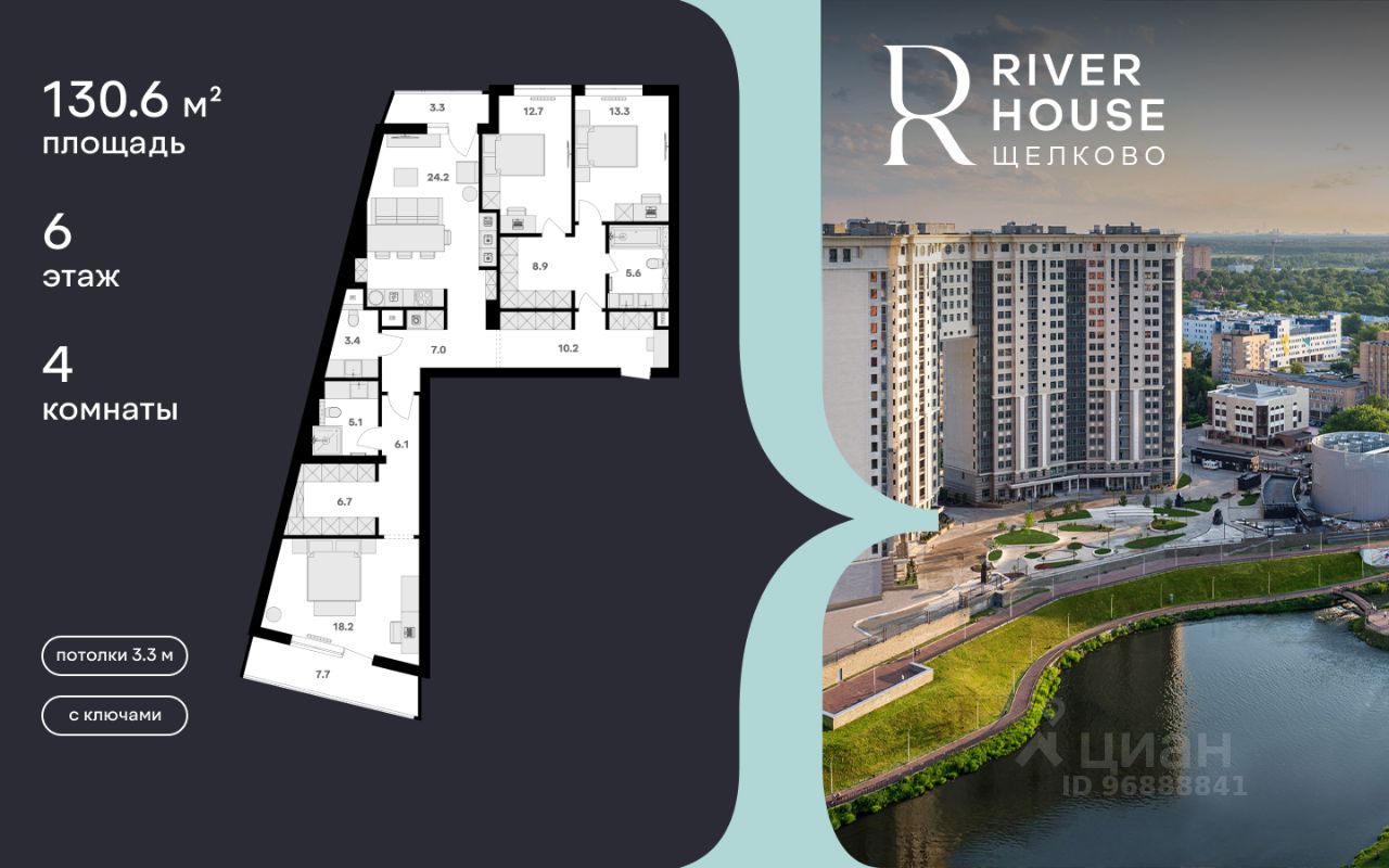 Просторная, светлая семейная квартира в жилом комплексе бизнес-класса RIVER HOUSE Щёлково! Семейная ипотека от 3.5%. Беспроцентная рассрочка. Индивидуальные дисконтные предложения. Дом сдан. Оформление в собственность. Ключи сразу после заключения договора купли-продажи. RIVER HOUSE Щёлково это изысканный жилой проект полноценного бизнес-класса с фокусом на качественное семейное проживание в самом центре города на набережной реки Клязьма. - Оригинальная архитектура, увеличенная площадь остекления, эксклюзивная вечерняя подсветка фасада. - Просторные семейные квартиры с высокими потолками 3.3 м в вариантах черновой, предчистовой и чистовой отделки. - Роскошные трехуровневые пентхаусы с открытыми террасами на кровле. - Лаунж-зона на кровле, где можно устроить уютный вечер с друзьями, отдохнуть и полюбоваться панорамными видами на город. - Вся необходимая инфраструктура и сервисы на первых двух этажах: детский сад, супермаркет, институт красоты, медицинский центр, стоматология, ПВЗ и многое другое. - В каждом подъезде 4 лифта один со спуском в паркинг, лобби с авторским дизайном, консьерж-сервисом и мягкой зоной ожидания. - Круглосуточная охрана, видеонаблюдение, бесключевая система доступа. - Двухуровневый подземный паркинг на 540 машино-мест и 260 кладовых. - Закрытый двор-парк без машин с ландшафтным дизайном, детскими и спортивными площадками, летним амфитеатром и собственным спуском к набережной. - Шаговая доступность ко всей инфраструктуре центра города: школы, детские сады, гимназии, кафе и рестораны, кинотеатр, перинатальный центр. - Три благоустроенных парка, в один из которых - Солнечные часы - можно спуститься со двора дома. RIVER HOUSE Щёлково это дом-впечатление и особый статус, которые останутся вашим детям и станут частью фамильной истории.