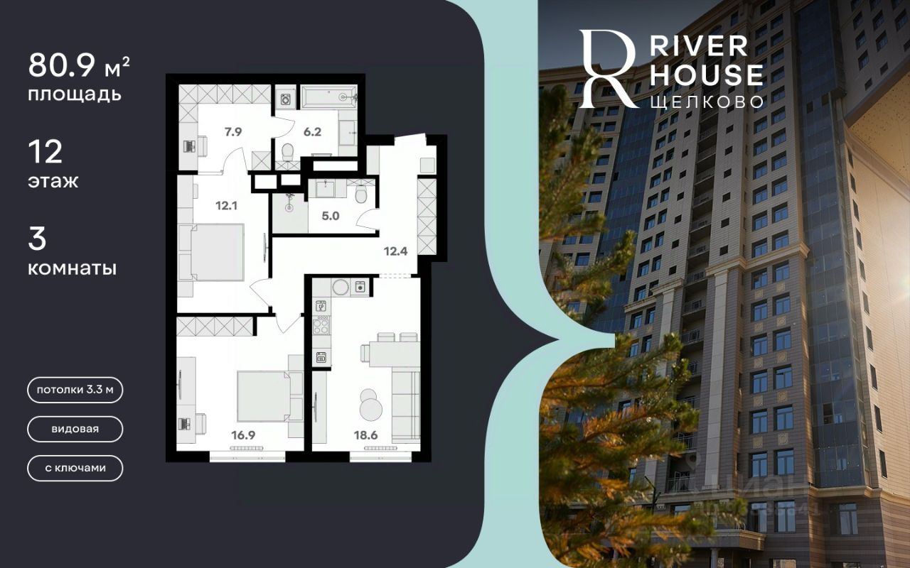 Просторная семейная квартира в жилом комплексе RIVER HOUSE Щёлково. Это изысканный жилой проект премиум-класса с фокусом на качественное семейное проживание в самом центре города на набережной реки Клязьма.