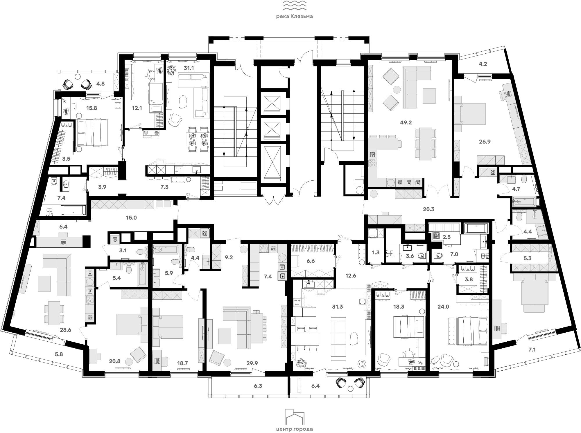 - Роскошные трехуровневые пентхаусы с открытыми террасами на кровле.