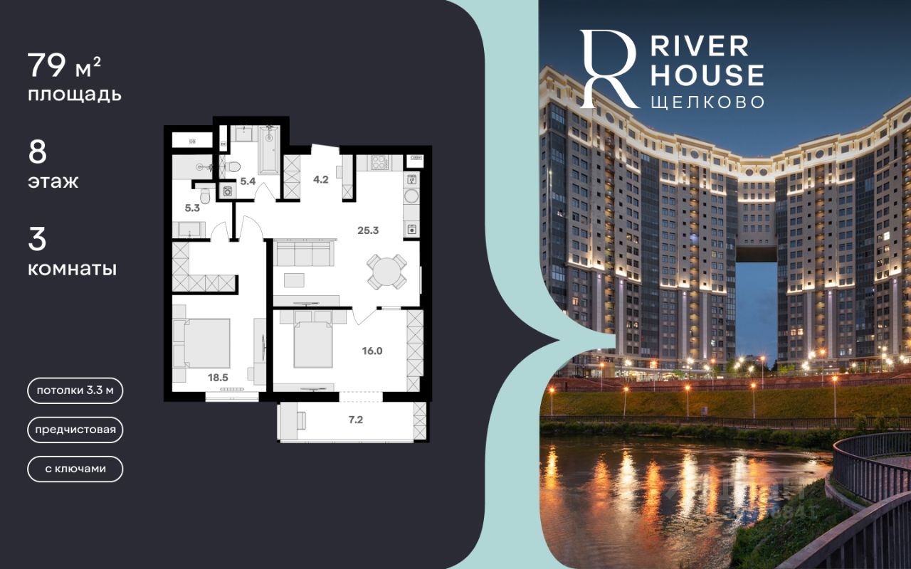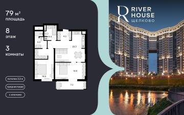 Просторная семейная квартира в жилом комплексе RIVER HOUSE Щёлково. Это изысканный жилой проект премиум-класса с фокусом на качественное семейное проживание в самом центре города на набережной реки Клязьма.