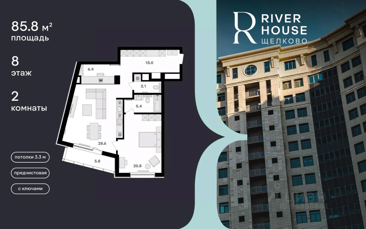Просторная семейная квартира в жилом комплексе RIVER HOUSE Щёлково. Это изысканный жилой проект премиум-класса с фокусом на качественное семейное проживание в самом центре города на набережной реки Клязьма.