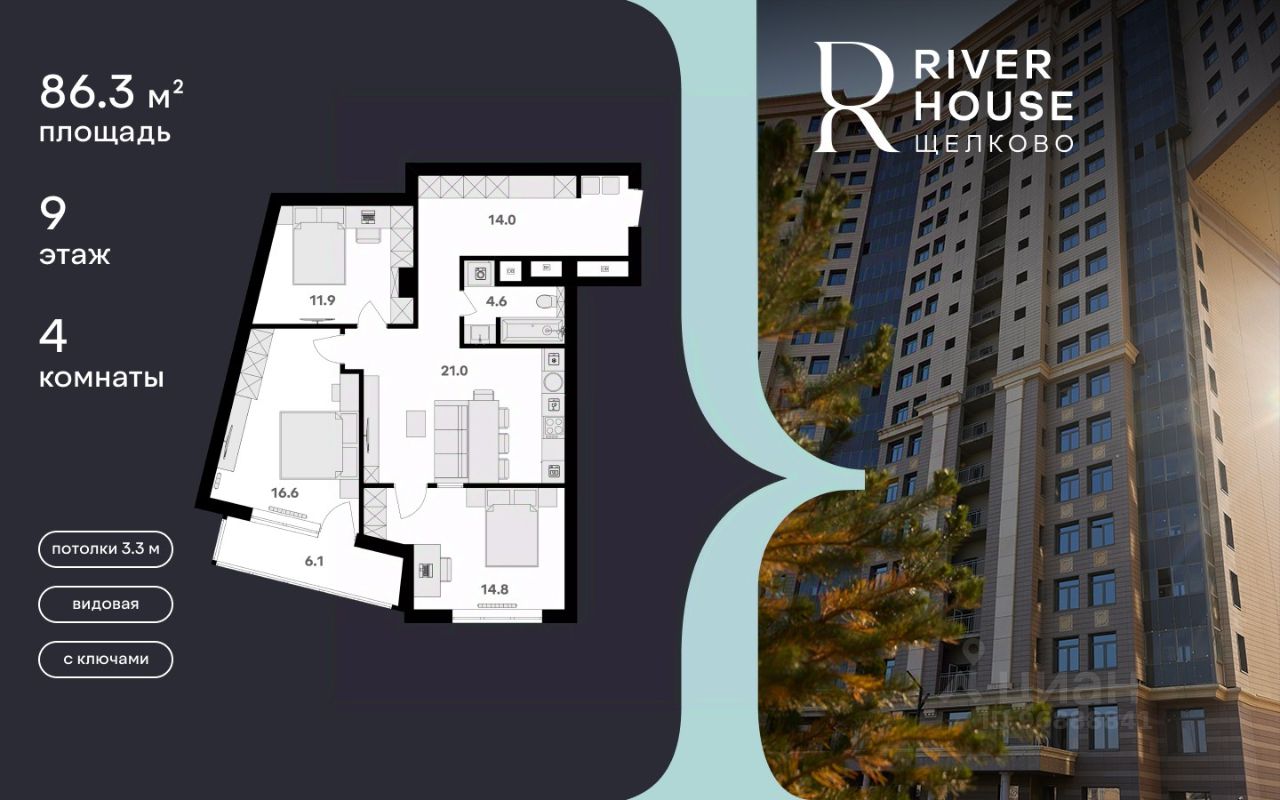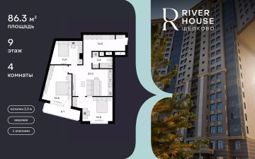 Просторная семейная квартира в жилом комплексе RIVER HOUSE Щёлково. Это изысканный жилой проект премиум-класса с фокусом на качественное семейное проживание в самом центре города на набережной реки Клязьма.