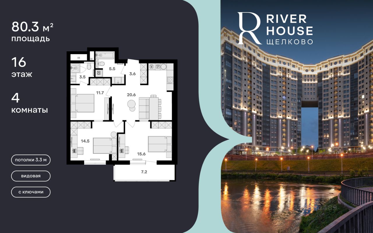 Просторная, светлая семейная квартира в жилом комплексе бизнес-класса RIVER HOUSE Щёлково! Семейная ипотека от 3.5%. Беспроцентная рассрочка. Индивидуальные дисконтные предложения. Дом сдан. Оформление в собственность. Ключи сразу после заключения договора купли-продажи. RIVER HOUSE Щёлково это изысканный жилой проект полноценного бизнес-класса с фокусом на качественное семейное проживание в самом центре города на набережной реки Клязьма. - Оригинальная архитектура, увеличенная площадь остекления, эксклюзивная вечерняя подсветка фасада. - Просторные семейные квартиры с высокими потолками 3.3 м в вариантах черновой, предчистовой и чистовой отделки. - Роскошные трехуровневые пентхаусы с открытыми террасами на кровле. - Лаунж-зона на кровле, где можно устроить уютный вечер с друзьями, отдохнуть и полюбоваться панорамными видами на город. - Вся необходимая инфраструктура и сервисы на первых двух этажах: детский сад, супермаркет, институт красоты, медицинский центр, стоматология, ПВЗ и многое другое. - В каждом подъезде 4 лифта один со спуском в паркинг, лобби с авторским дизайном, консьерж-сервисом и мягкой зоной ожидания. - Круглосуточная охрана, видеонаблюдение, бесключевая система доступа. - Двухуровневый подземный паркинг на 540 машино-мест и 260 кладовых. - Закрытый двор-парк без машин с ландшафтным дизайном, детскими и спортивными площадками, летним амфитеатром и собственным спуском к набережной. - Шаговая доступность ко всей инфраструктуре центра города: школы, детские сады, гимназии, кафе и рестораны, кинотеатр, перинатальный центр. - Три благоустроенных парка, в один из которых - Солнечные часы - можно спуститься со двора дома. RIVER HOUSE Щёлково это дом-впечатление и особый статус, которые останутся вашим детям и станут частью фамильной истории.