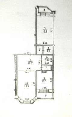 Планировка квартиры - распашонка (окна на разные стороны), общая площадь с балконом и лоджией - 71 кв.м (без - 68,8 кв.м), комнаты изолированные, площадью: 18,9 и 16,3 кв.м, кухня - 10,5 кв.м, отличный холл - 12,7 кв.м, выход на лоджию (2,9 кв.м) из кухни, выход на балкон (2,5 кв.м) из маленькой комнаты, застеклены и отделаны, санузел раздельный, теплые (электрические) полы, общий тамбур на две квартиры.