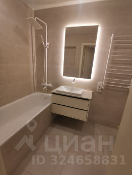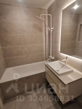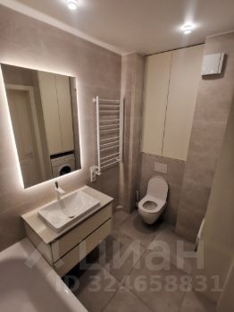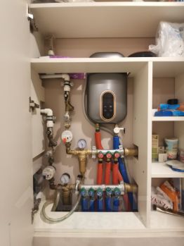 В ванной - крупноформатный керамогранит, тёплый пол, хорошая сантехника. Узел водоснабжения - трубы Rehau (Германия), гребенки Far (Италия), проточный водонагреватель.