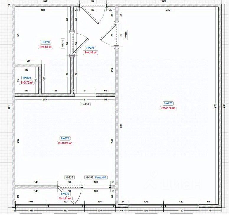 Квартира современной планировки: общая площадь 40,3 м2, площадь комнаты 22,8 м2, площадь кухни 10,2 м2, общая площадь с учетом застекленной лоджии 42,2 м2. Лоджия имеет вход из кухни.