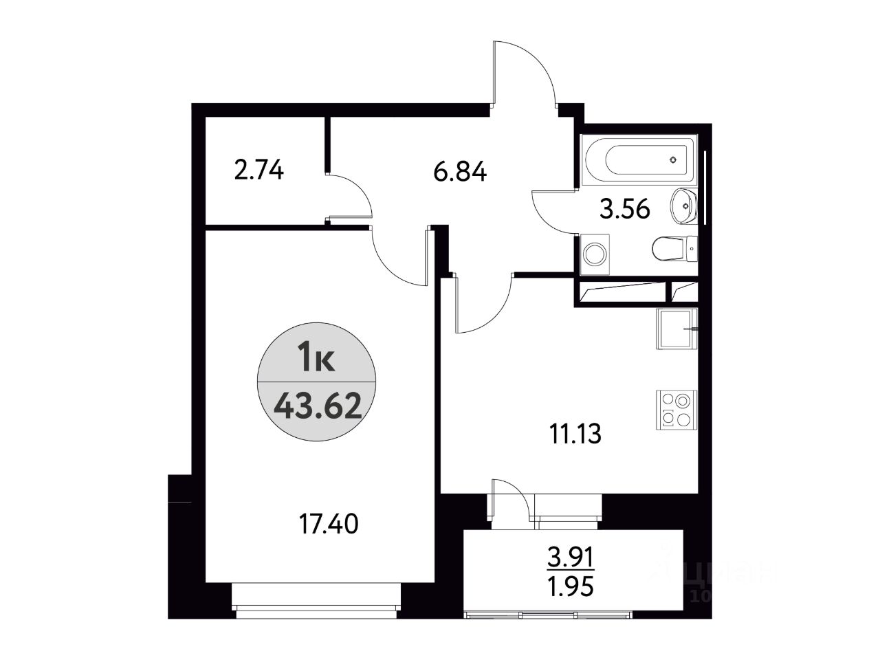 Продается 1-комн. квартира, 43,62 м²