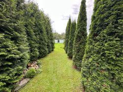 На участке ландшафтный дизайн (туи, можжевельник, Канадская ель, горная сосна, данники, разновидность гортензий).