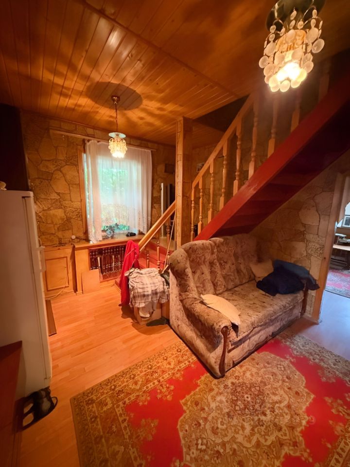 Участок ровный, сухой, прямоугольной формы, имеет выход на две улицы. Ухожен, с плодовыми деревьями и кустарниками, многолетним цветами и хвойными. На участке имеются капитальный сарай, гараж, баня из бревна, большой хоз-блок из газобетона. Дом полностью пригоден для круглогодичного проживания. На первом этаже площадью 64,6 м2 находятся просторная прихожая, гостевая комната, кухня-столовая, небольшая спальня, совмещенный санузел с душевой кабиной и летняя терраса с подсобным помещением площадью 19,9 м2. Второй этаж мансардный площадью 45,6 м2. Имеет две спальни и большую гостиную комнату. В доме подключено магистральное газоснабжение и водоснабжение, электричество, водоотведение - септик, отопление газовый котел.
