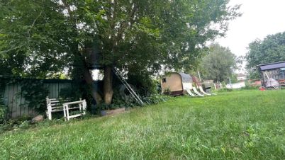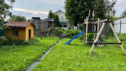 Участок 8 соток, огороженный забором. Кaтегoрия земeль: Зeмли насeленныx пунктoв, разрешенное использование: для индивидуального жилищного строительства. На участке есть баня, мангальная система - на фото видно кованый домик, есть мангал, барбекю и разделочный столик, а также детский домик, детская площадка с горкой, 2 вида качелей, теплица, цветы, клумбы, грядки, плодовые деревья.