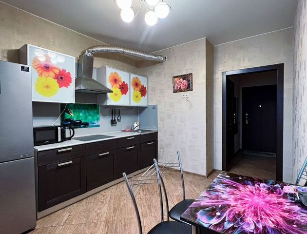 Кухня: Обеденный стол со стульями, холодильник, варочная панель, электрический чайник, телевизор, вся необходимая посуда для приготовления и приёма пищи.